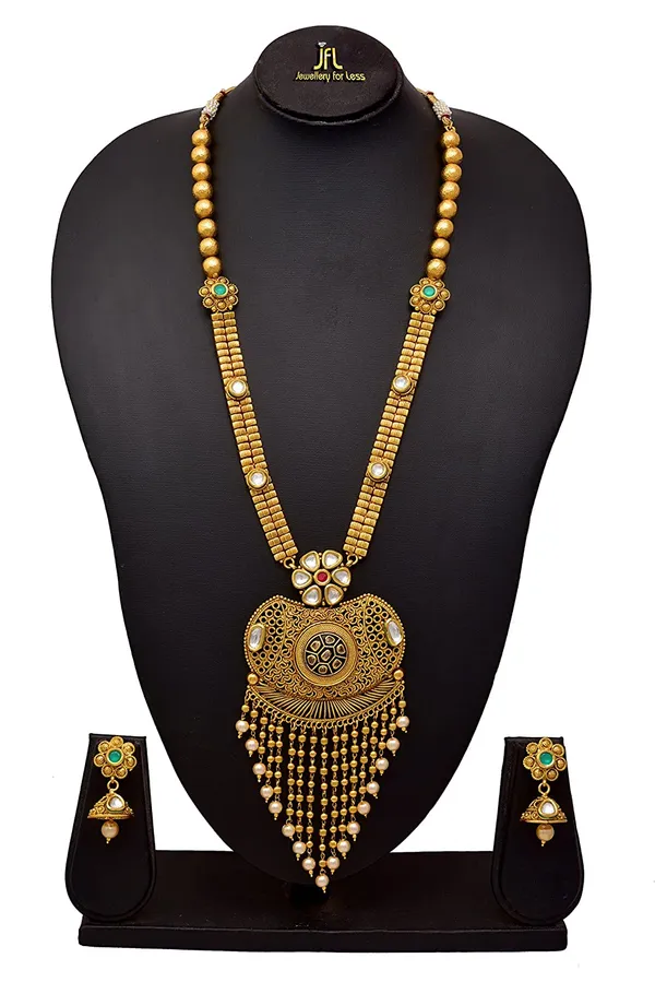 JFL - Traditional Ethnic One Gram Gold Plated Real Kundan Champagne Pearl Long Designer Necklace Set with Jhumka Earrings and Women