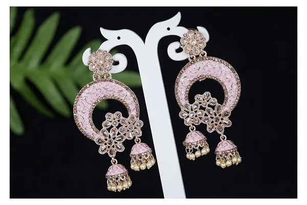 Baby Pink Contemporary Gold Plated St1 Studded Meenakari Design Floral Jhum..More