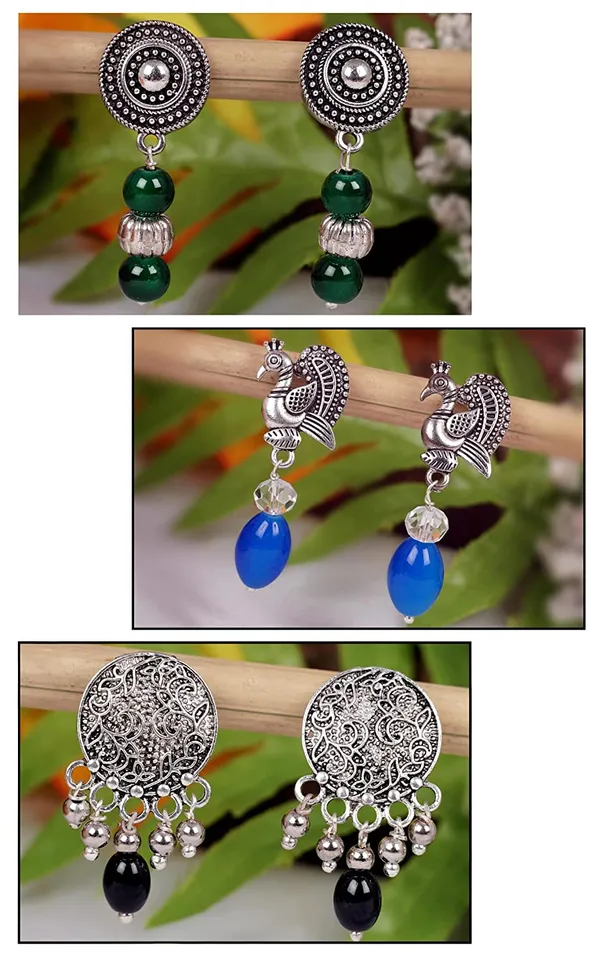 Black, Green, Blue Trendy Oxidised Silver Plated Handmade Beaded Dangler Ea..More