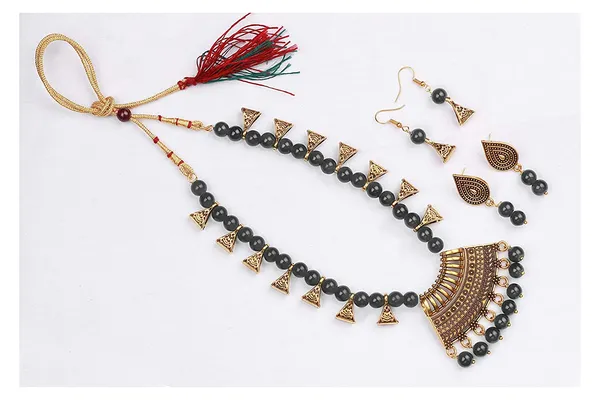 Black Gold German Oxidized Onyx Beaded Necklace Set With Adjustable Thread