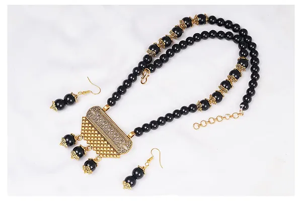 Black Gold Plated Black Beads Oxidized Pendant Necklace Set With Adjustable..More
