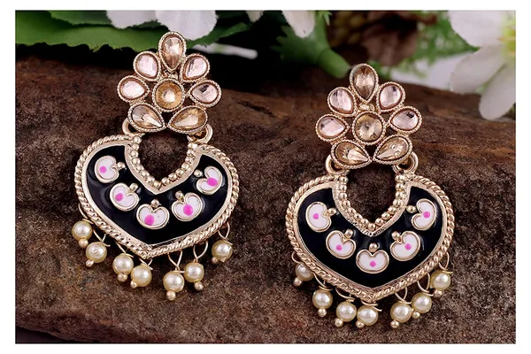 Black Gold T1 Enamel Meenakari Cz Polki St1 Pearl Chandbali Earring