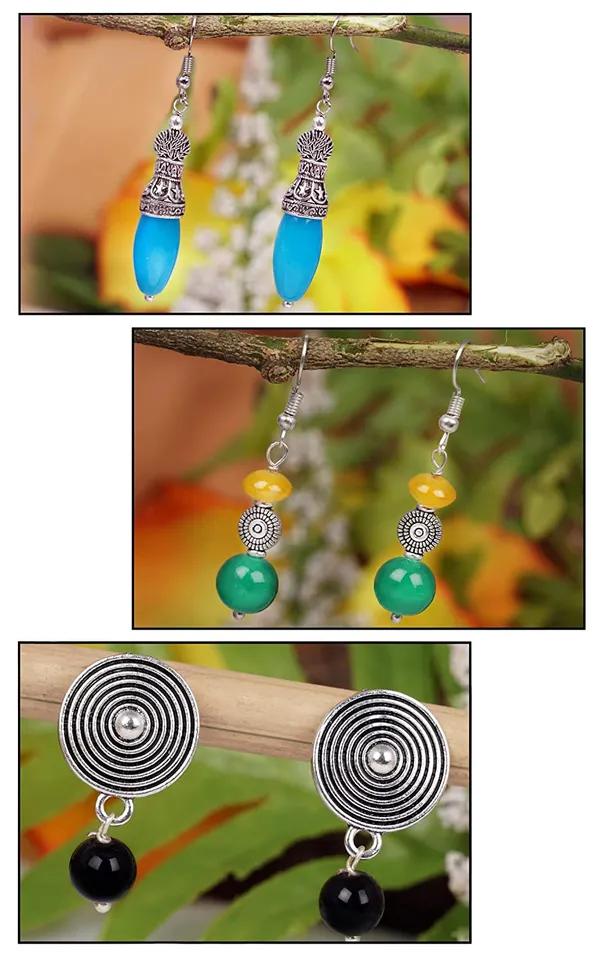 Black,Sky Blue,Green Oxidised Silver Plated Handmade Beaded Dangler Earring