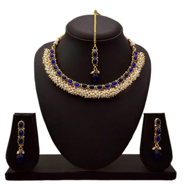 Blue 1 Gm Gold Plated Blue Pearl Necklace Set With Earrings Maang Tikkas