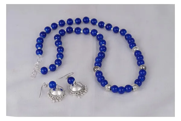 Blue German Silver Oxidized And Beaded Necklace And Jhumki Earring