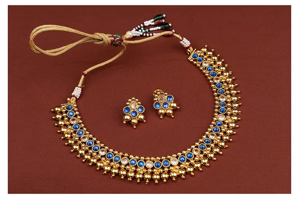 Blue Gold Plated Cz American Diamond And Blue St1 Studded Necklace Set With..More