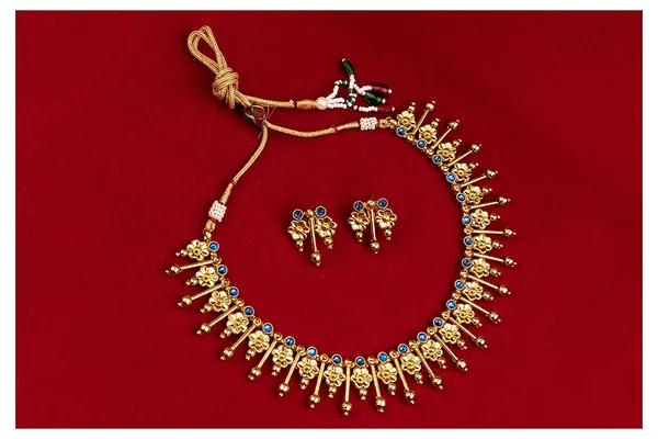 Blue Gold Plated Floral Blue St1 Studded Necklace Set With Adjustable Threa..More