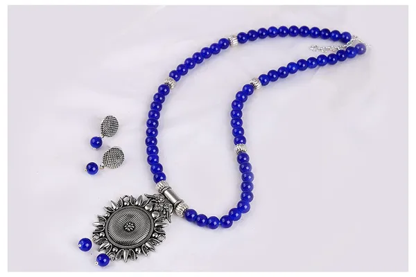 Blue Silver Plated Oxidized Pendant With Beaded Necklace Set