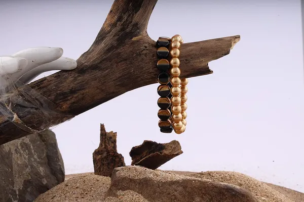 Combo Of 10 Mm Flat Round Dual Tone Black And Gold Beads And Gold Pearl Han..More