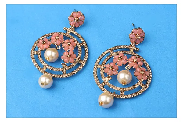 Dark Peach Gold T1 Floral Design Polki St1 And Diamond With Pearl Drop Dang..More