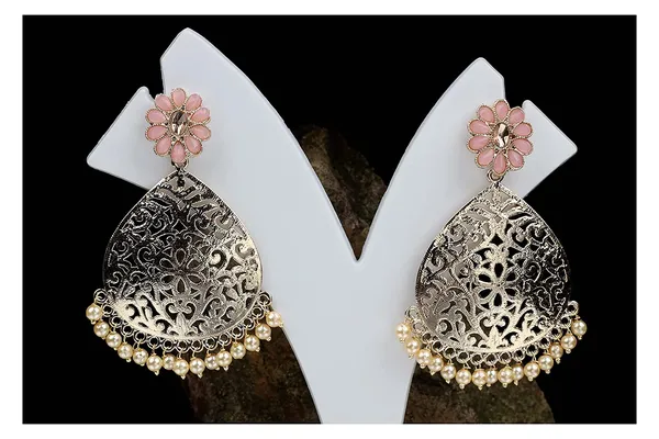 Dark Peach Gold T1 Polki St1 Studded Filigree Earrings With Pearl Danglers