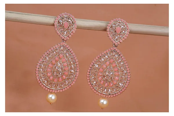 Dark Peach Gold T1 Polki St1 Studded With Pearl Drop Dangler Earrings