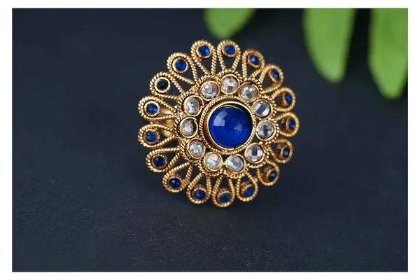 Ethnic White And Blue Color Stone Studded Gold Plated Floral Adjustable Fin..More