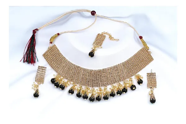 Fancy Cz Diamond And Beads Choker Necklace Set With Maang Tikka For Women A..More