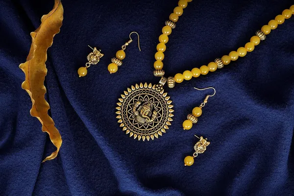 Fashionable Gold Plated Oxidized German Ganesha Beaded Necklace With 2 Pair..More