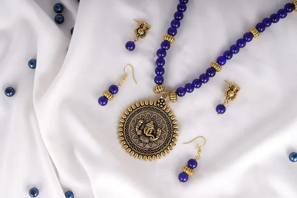 Fashionable Gold Plated Oxidized German Ganesha Beaded Necklace With 2 Pair..More