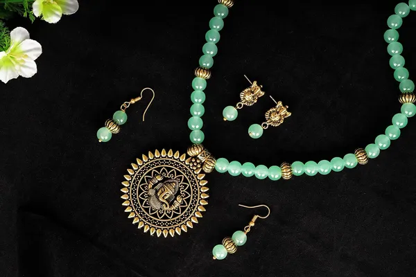 Fashionable Gold Plated Oxidized German Ganesha Beaded Necklace With 2 Pair..More