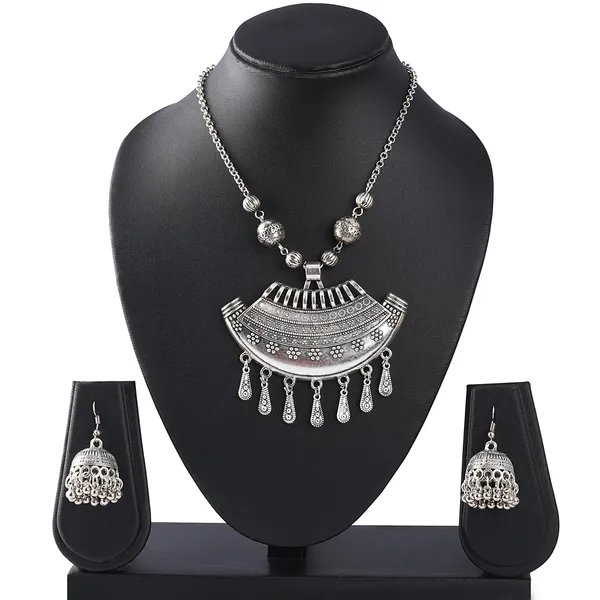 Fashionable Silver Plated German Oxidized Floral Pendant With Long Chain Ha..More