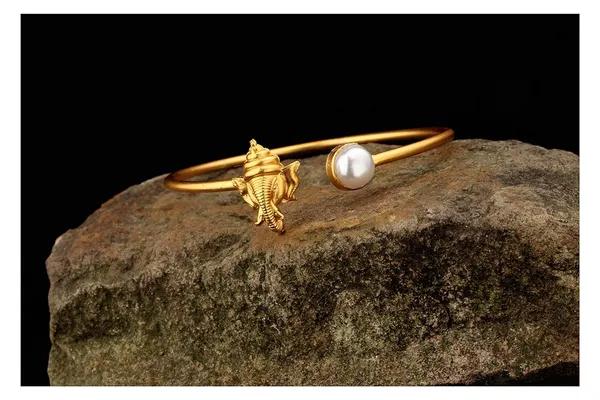 Ganesha Designer Delicate Gold Plated Adjustable Kada With White Pearl For ..More