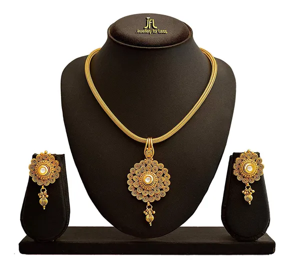 Gold Beautiful Spiral Kundan Pendant With Bead Chain & Earring Sets