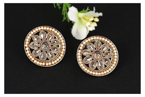 Gold Gold T1 Floral Cz Polki St1 Round Stud Earring With Pearls