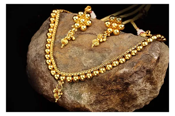 Gold Golden Gold Plated Single Patta Bead Necklace Set With Adjustable Thre..More