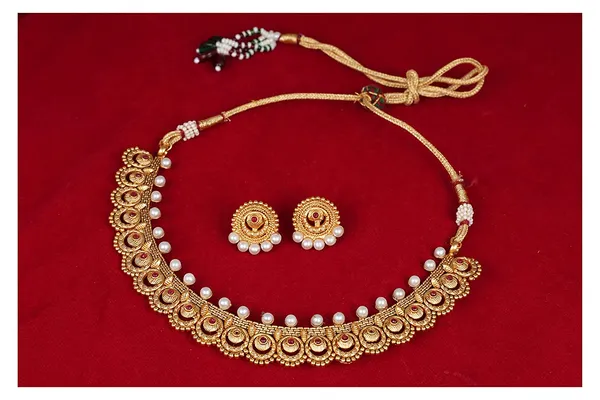 Gold Matte Gold Plated Necklace Set With Pearl & St1 With Adjustable Thread