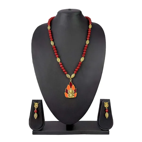 Gold Plated Enamel Ganesha Onyx Stone Necklace Set (Maroon)