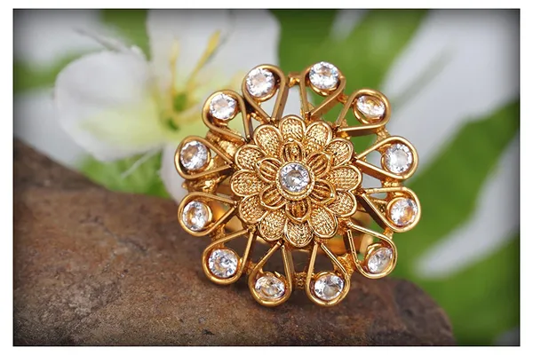 Gold Plated Floral Design White St1 Studded Adjustable Finger Ring