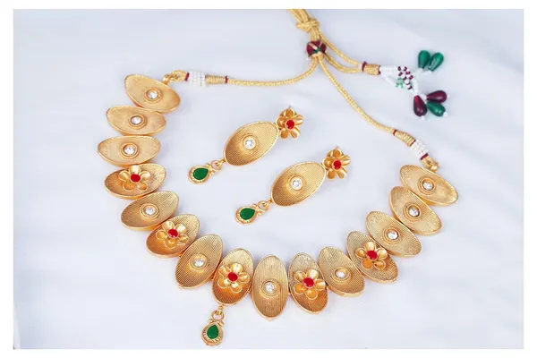 Gold Plated Oval Shape Floral Design Cz American Diamond With Red And Green..More