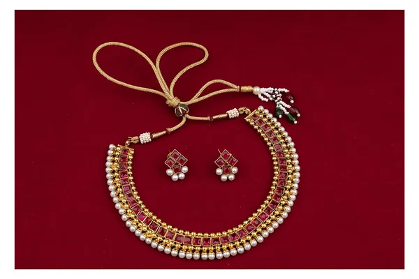 Gold Plated Square Red Stone And Pearl Studded Necklace Set With Adjustable..More