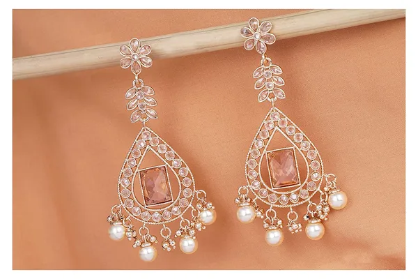 Gold T1 Floral Rectangle Crystal And Polki St1 Drop Shape Earring /Girls