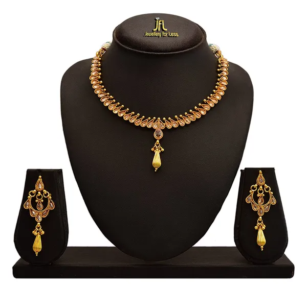 JFL - Traditional Ethnic One Gram Gold Plated Polki Diamond Designer Necklace Set with Earrings