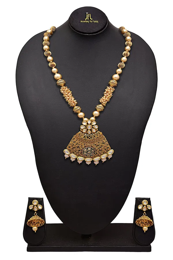 JFL - Traditional Ethnic One Gram Gold Plated Real Kundan LCD Champagne Pearl Designer Necklace Set with Jhumka Earrings and Women