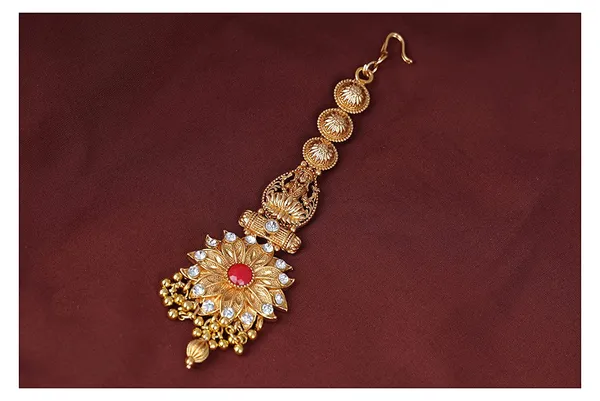Golden Gold Plated Leaf Kundan Lakshmi Design Maang Tikka