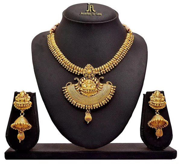 JFL - Traditional Ethnic Temple Goddess Laxmi One Gram Gold Plated Designer Necklace Set Jhumka Earring