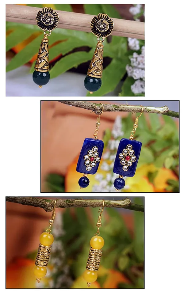 Green, Blue, Yellow Oxidised Gold Plated Handmade Beaded Dangler Earring