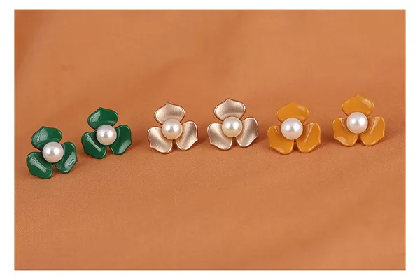 Green, Gold, Yellow Combo Of 3 Floral Pearl Stud Earrings