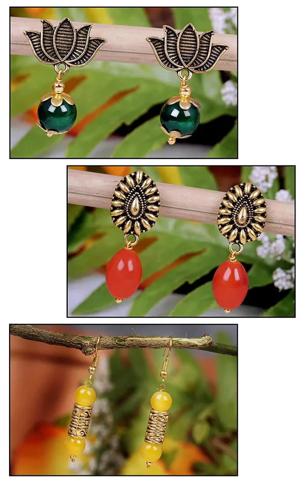 Green, Orange, Yellow Oxidised Gold Plated Handmade Beaded Dangler Earring