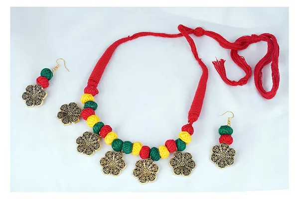 Green, Yellow Floral Gold German Silver Oxidized Cotton Beads With Cotton A..More