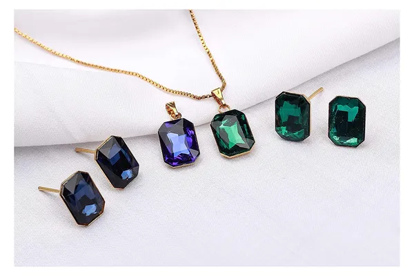 Green And Blue Combo Gold Plated Crystal Pendant With Chain And Earrings