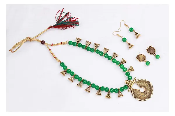 Green Gold Oxidized Combo Of 2 Earrings And Beaded Necklace Set With Adjust..More