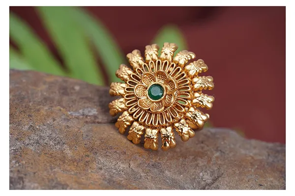 Green Gold Plated Floral St1 Studded Adjustable Finger Ring