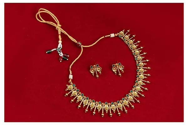 Green Gold Plated Floral St1 Studded Necklace Set With Adjustable Thread