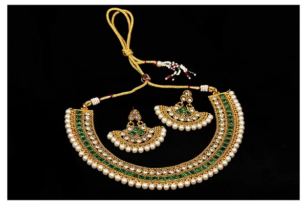 Green Gold Plated Square St1 And Diamond Studded With Pearls Necklace Set W..More