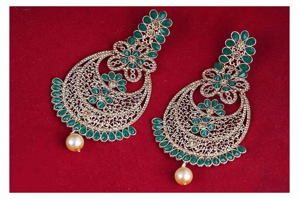 Green Gold T1 Cz American Diamond Polki St1 Studded Floral Chandbali Filigr..More
