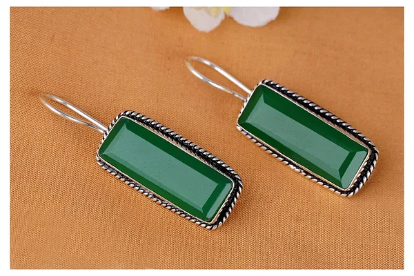 Green Oxidized Silver Plated Rectangle Shape Crystal Earrings