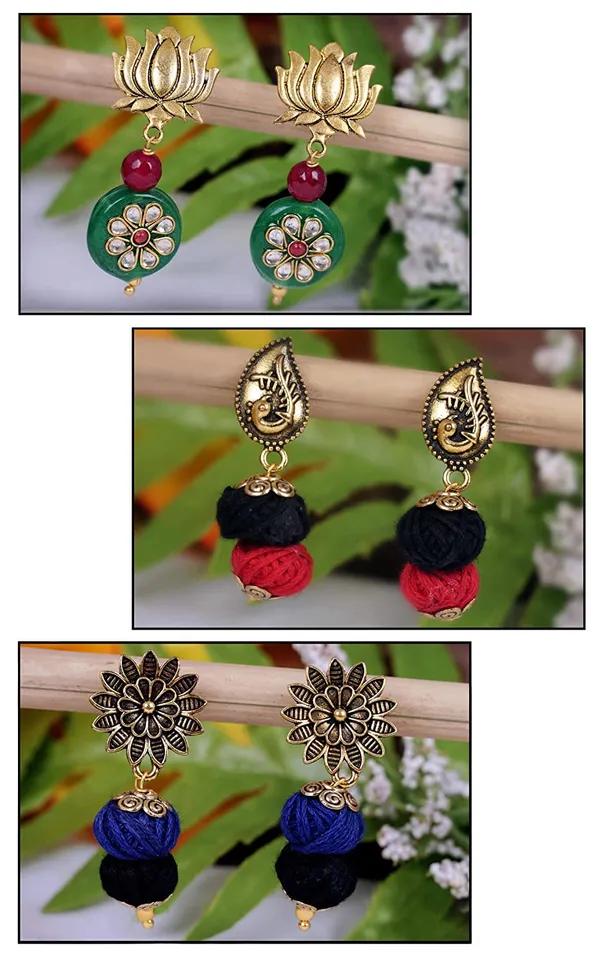 Green,Red,Black Floral Oxidised Gold Plated Handmade Beaded Dangler Earring