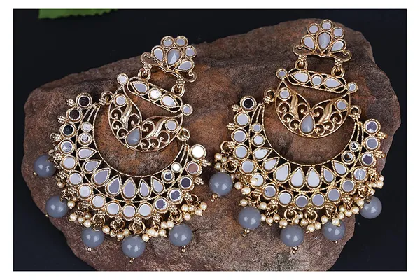 Grey Beautiful Chandbali Mirror Work Pearl Beads Hanging Earring