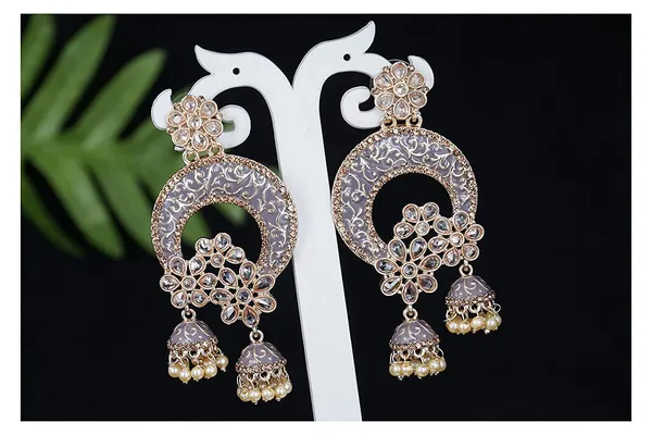 Grey Contemporary Gold Plated St1 Studded Meenakari Design Floral Jhumki Ea..More